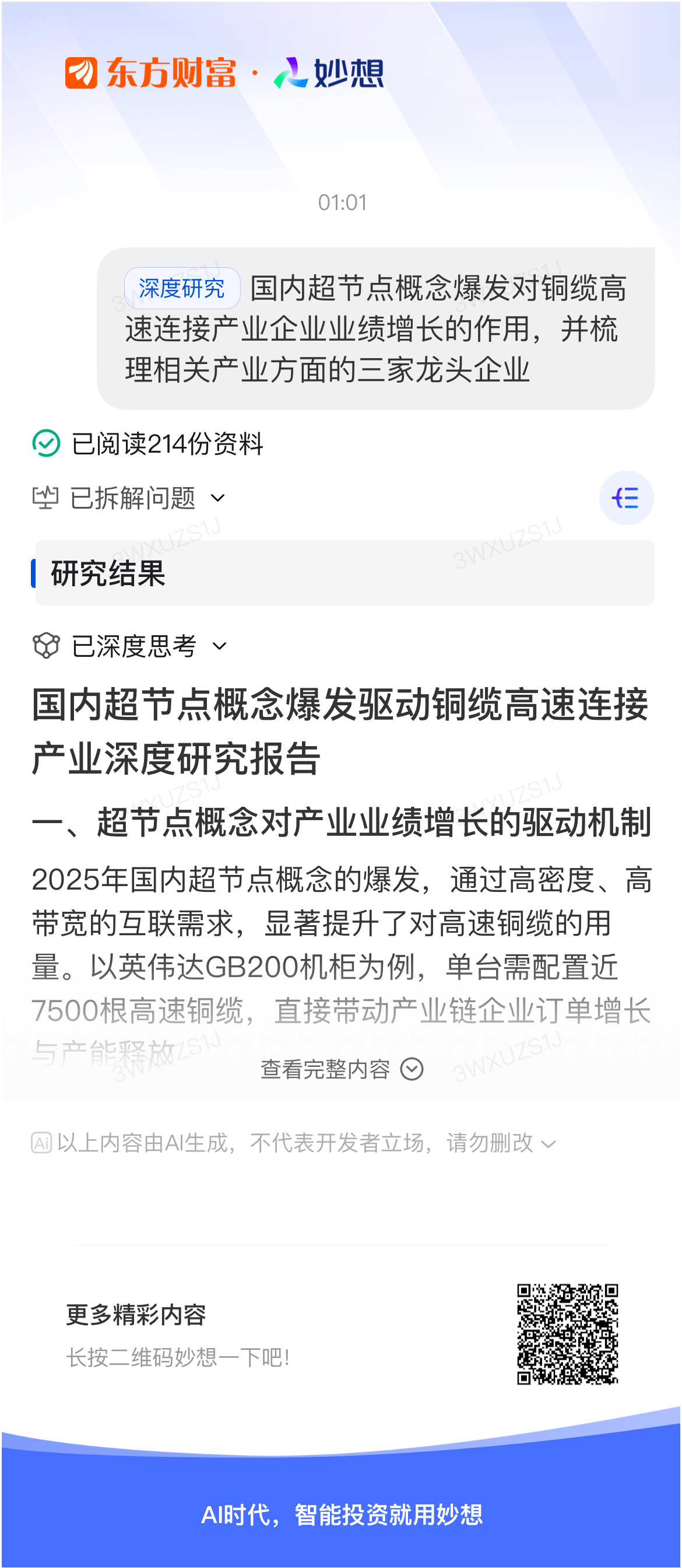 #@妙想,你怎么看?# 妙想一下:国内超节点概念爆发对铜缆高速连接产业企业业绩增长的作用,并梳理相关产业方面的三家龙头企业