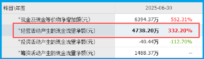 先说说最让财官惊喜的——经营活动产生的现金流量净额。今年二季度达到4738万元,同比猛增332%。