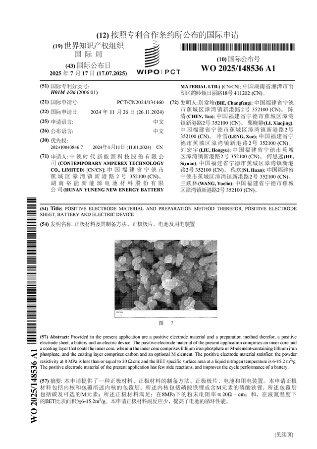 证券之星消息,根据企查查数据显示湖南裕能(301358)公布了一项国际专利申请,专利名为“正极材料及其制备方法、正极极片、电池及用电装置”,专利申请号为PCT/CN2024/134460,国际公布日为2025年7月17日。