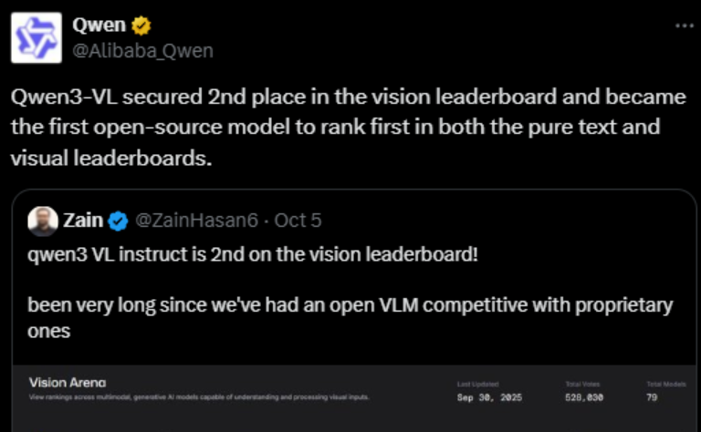 据署名为“QWEN”的X账号突然发布消息称,阿里巴巴大模型QWEN3-VL荣登视觉排行榜第二名,并成为首个同时在纯文本和视觉排行榜上均排名第一的开源模型。