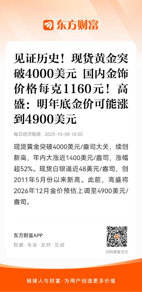 见证历史!现货黄金突破4000美元 国内金饰价格每克1160元!高盛:明年底金价可能涨到4900美元每日经济新闻