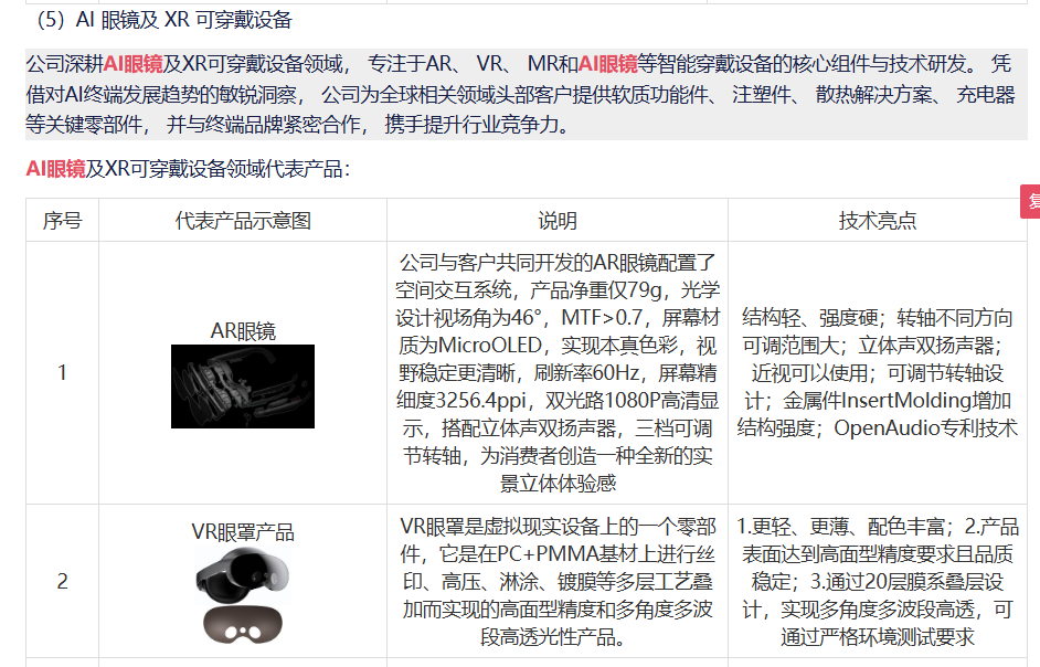 业务覆盖与产品能力:公司业务涵盖 AI 终端全链条,包括 AI 手机、AI PC、AI 眼镜等消费电子品类,具备软质功能件、注塑件、散热解决方案、充电器等核心零部件的研发生产能力,可满足无屏设计、多传感器交互等新型 AI 消费电子的硬件配套需求。