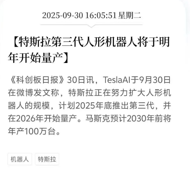 10 月 7 日,特斯拉 Optimus 机器人在洛杉矶《Tron:ARES》电影首映礼上公开展示,流畅完成太极风格动作;10 月 4 日,马斯克发布 Optimus 学习功夫的视频,机器人可精准完成格挡、反击动作,被推搡后还能通过调整重心恢复平衡,马斯克明确回应网友质疑 “由 AI 驱动,非遥控操作”,标志着 Optimus 从预设程序向动态交互能力实现关键突破。此外,TeslaAl于9月30日在发文称,特斯拉正在努力扩大人形机器人的规模,计划2025年底推出第三代,并在2026年开始量产。马斯克预计2030年前将年产100万台。