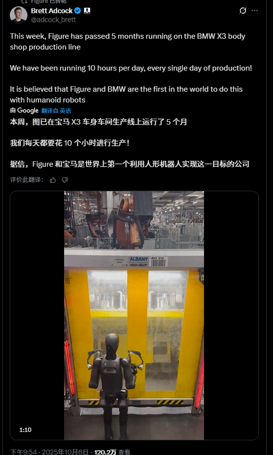 此前 10 月 6 日,Figure 创始人透露,其人形机器人已在宝马 X3 车身车间生产线稳定运行 5 个月,每日持续作业 10 小时,承担钣金搬运与精准装配任务,Figure 与宝马成为全球首个实现人形机器人生产线常态化应用的企业组合。