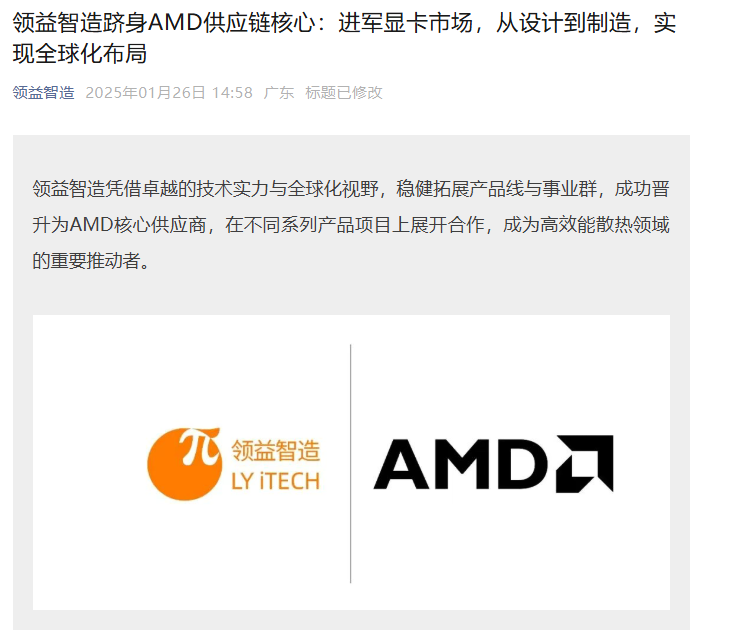 合作资质与全球化布局:凭借技术实力与全球化视野,在 AMD 不同系列产品项目上展开合作,整合自主研发的热管与均热板技术,以精密散热设计助力显卡稳定高效运行,相关合作细节可参考公司 2025 年 1 月 26 日公众号文章《领益智造跻身 AMD 供应链核心:进军显卡市场,从设计到制造,实现全球化布局》。