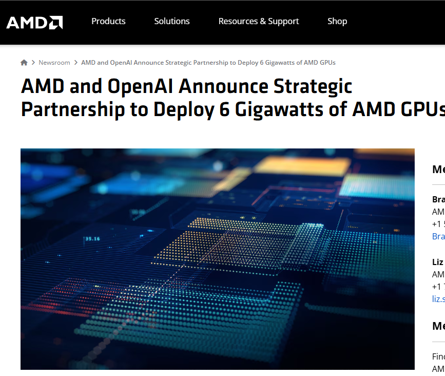 当地时间 10 月 6 日,AMD 与 OpenAI 官宣 6 吉瓦算力合作协议,将为 OpenAI 下一代 AI 基础设施供应多代 AMD Instinct GPU,首批 1 吉瓦 MI450 GPU 计划 2026 年下半年启动部署;同时 AMD 向 OpenAI 发行最高 1.6 亿股普通股认股权证,此次合作预计为 AMD 带来数百亿美元收入。消息发布后,AMD 股价最高暴涨近 38%。