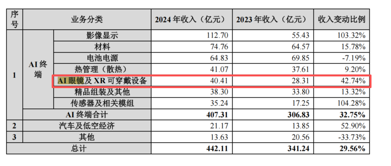 技术积累支撑:在热管理、材料工艺(金属加工、注塑、CNC 等)、结构设计等领域积累深厚,能根据客户差异化需求提供定制化组件方案,适配 OpenAI 与 Jony Ive 合作的 “设备家族” 创新方向;同时布局传感器及相关模组业务,2024 年收入达 35.24 亿元,较 2023 年同比增长 104.28%,为 AI 消费电子提供多维度组件支持。
