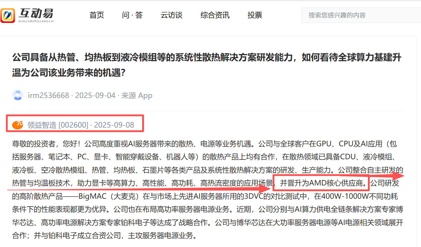 领益智造高度重视 AI 服务器带来的散热、电源业务机遇,目前已正式晋升为 AMD 核心供应商,具体合作亮点如下: