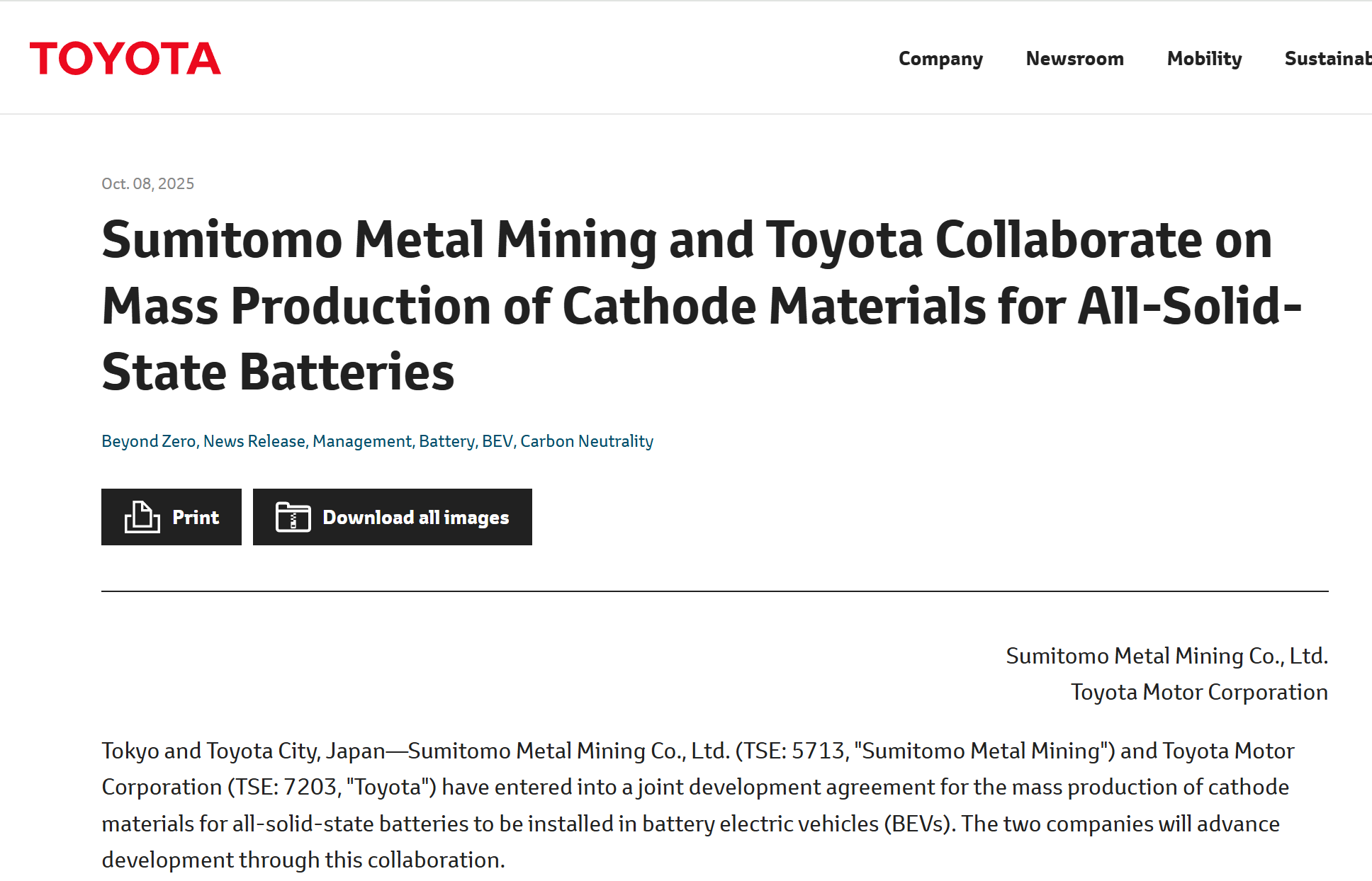 10月8日,丰田汽车全球官网发布消息称,住友金属矿山株式会社(以下简称“住友金属矿山”)与丰田汽车就量产用于纯电动汽车(BEV)的全固态电池正极材料达成合作协议。双方将通过此次合作推进研发进程。