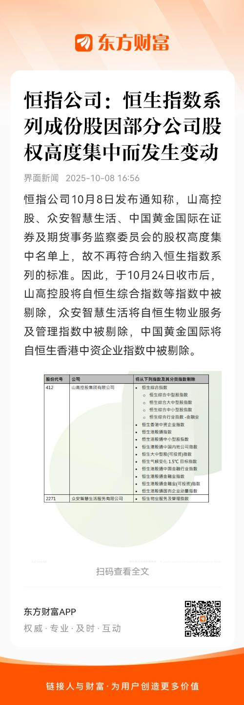 恒指公司10月8日发布通知称,山高控股、众安智慧生活、中国黄金国际在证券及期货事务监察委员会的股权高度集中名单上,故不再符合纳入恒生指数系列的标准。因此,于10月24日收市后,山高控股将自恒生综合指数等指数中被剔除,众安智慧生活将自恒生物业服务及管理指数中被剔除,中国黄金国际将自恒生香港中资企业指数中被剔除。