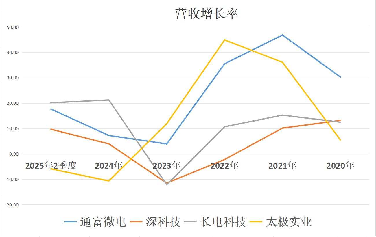 四家公司中,业务规模增长最快的是通富微电,过去五年平均每年营收增长率达到24.76%,其次太极实业,再次长电科技,再次深科技。