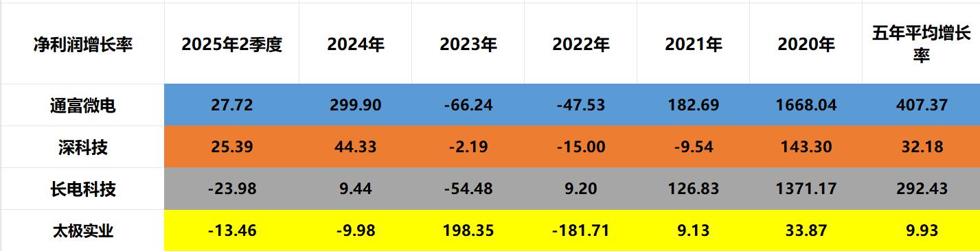 四家公司中,利润成长最快的是通富微电,过去五年平均每年净利润增长率为407%,其次长电科技,再次深科技,再次太极实业。
