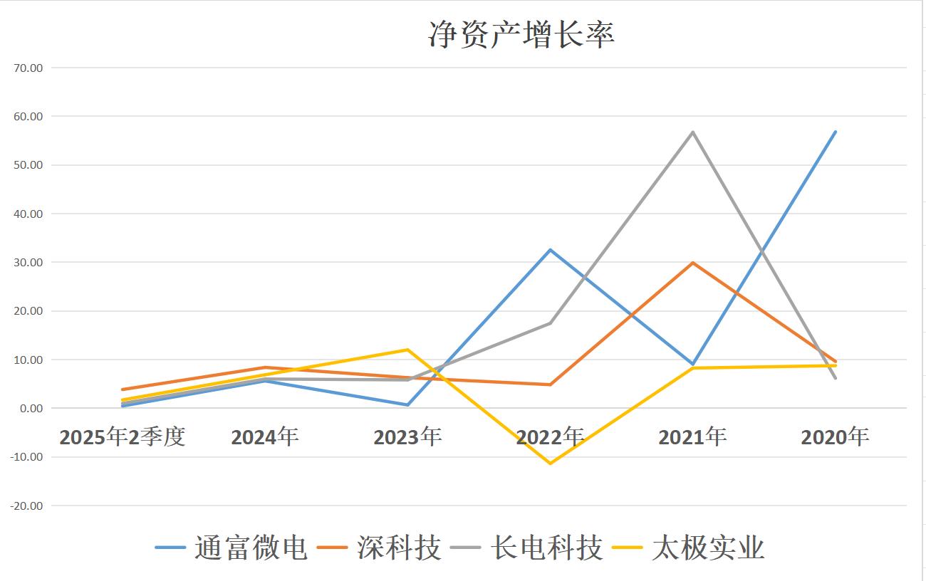 通富微电在过去五年平均净资产增长率达到了20.88%最高,其次长电科技,再次深科技,再次太极实业。