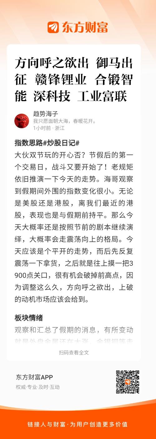 大伙双节玩的开心否?节假后的第一个交易日,战斗又要开始了!老规矩依旧推演一下今天的走势。海哥观察到假期间外围的指数变化很小。无论是美股还是港股,离我们最近的港股,表现也是与假期前持平。那么今天大概率还是按照节前的剧本继续演绎,大概率会走震荡向上的格局。今天应该是个平开的走势,而后先反复震荡一下拿货,之后就是往上摸一把3900点关口,很有机会破掉前高点,因为调整这么久,方向呼之欲出,上破的动机市场应该会给到。