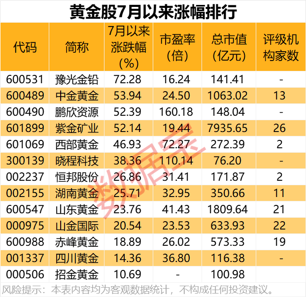 人民财讯10月9日电,国庆中秋长假期间,国际金价大幅度上涨。据证券时报·数据宝统计,A股中黄金板块个股共有13只,下半年以来平均上涨35.14%,豫光金铅、中金黄金、鹏欣资源涨幅居前,分别达到72.28%、53.94%、52.39%。招金黄金、四川黄金、赤峰黄金相对滞涨,累计涨幅均在20%以内。机构关注度来看,共有6股获得10家以上机构评级。紫金矿业、山金国际、山东黄金居前,分别为26家、22家、21家。根据机构一致预测数据,上述6只黄金股2025年~2027年归母净利润均预计实现上涨。