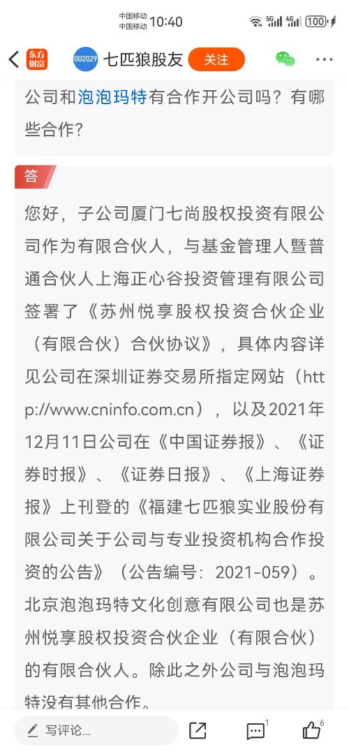 问公司和泡泡玛特有合作开公司吗?有哪些合作?答您好,子公司厦门七尚股权投资有限公司作为有限合伙人,与基金管理人暨普通合伙人上海正心谷投资管理有限公司签署了《苏州悦享股权投资合伙企业(有限合伙)合伙协议》,具体内容详见公司在深圳证券交易所指定网站(http://www.cninfo.com.cn),以及2021年12月11日公司在《中国证券报》、《证券时报》、《证券日报》、《上海证券报》上刊登的《福建七匹狼实业股份有限公司关于公司与专业投资机构合作投资的公告》(公告编号:2021-059)。北京泡泡玛特文化创意有限公司也是苏州悦享股权投资合伙企业(有限合伙)的有限合伙人。除此之外公司与泡泡玛特没有其他合作。
