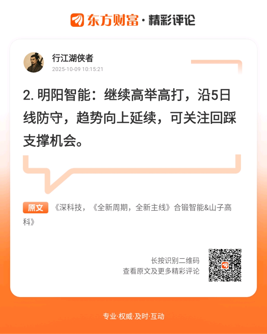 多谢你提点啊,真系帮到我。//@行江湖侠者 :2. 明阳智能:继续高举高打,沿5日线防守,趋势向上延续,可关注回踩支撑机会。
