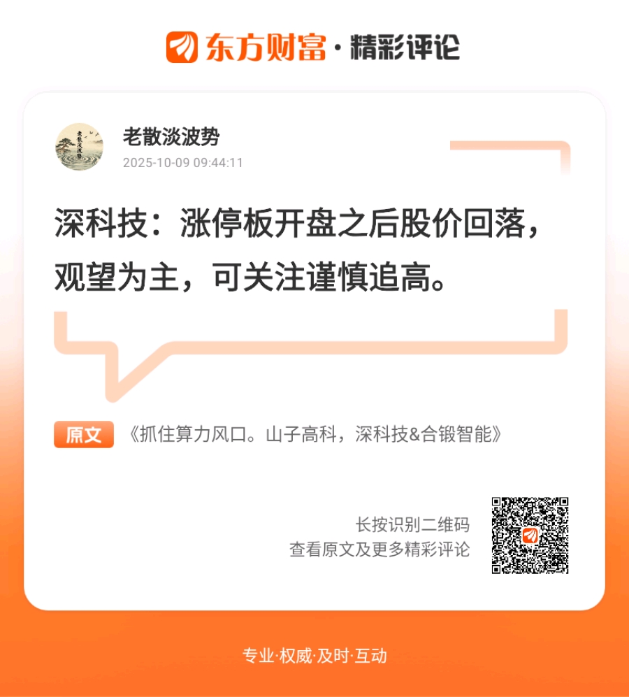 果然系老经验,方向睇得透晒。//@老散淡波势 :深科技:涨停板开盘之后股价回落,观望为主,可关注谨慎追高。