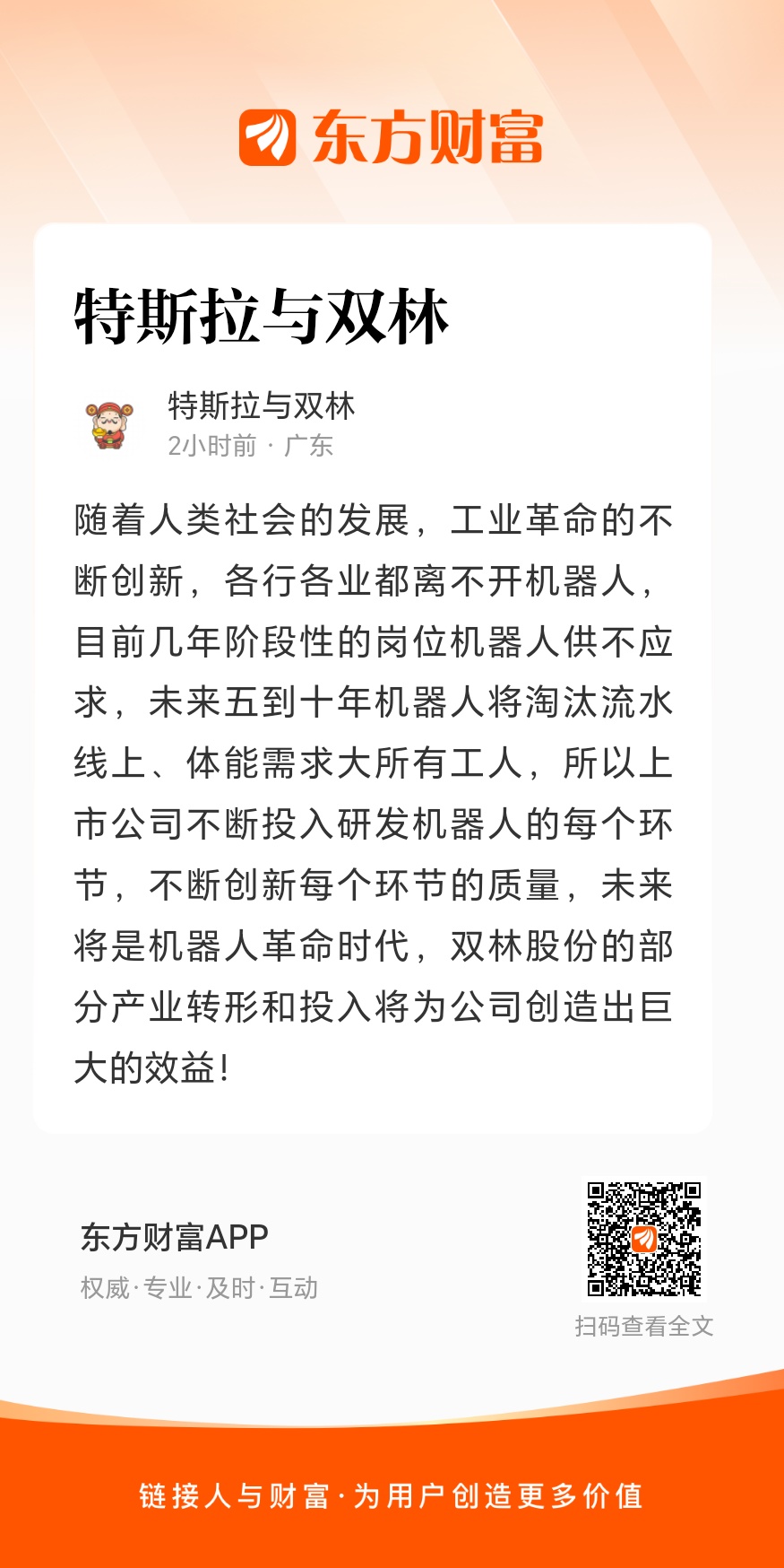 随着人类社会的发展,工业革命的不断创新,各行各业都离不开机器人,目前几年阶段性的岗位机器人供不应求,未来五到十年机器人将淘汰流水线上、体能需求大所有工人,所以上市公司不断投入研发机器人的每个环节,不断创新每个环节的质量,未来将是机器人革命时代,双林股份的部分产业转形和投入将为公司创造出巨大的效益!