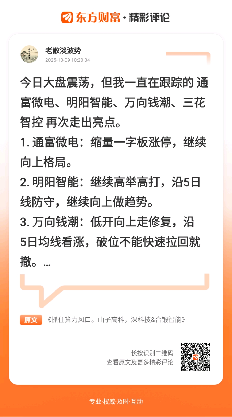 感谢你指导,之后我会注意返。//@老散淡波势 :今日大盘震荡,但我一直在跟踪的 通富微电、明阳智能、万向钱潮、三花智控 再次走出亮点。1. 通富微电:缩量一字板涨停,继续向上格局。2. 明阳智能:继续高举高打,沿5日线防守,继续向上做趋势。3. 万向钱潮:低开向上走修复,沿5日均线看涨,破位不能快速拉回就撤。4. 三花智控:今天缩量调整,5日线支撑有效,支撑不破就还是安全的,继续格局。