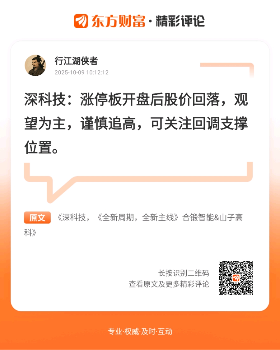 感谢你提醒我,啲细节真系容易忽略。//@行江湖侠者 :深科技:涨停板开盘后股价回落,观望为主,谨慎追高,可关注回调支撑位置。