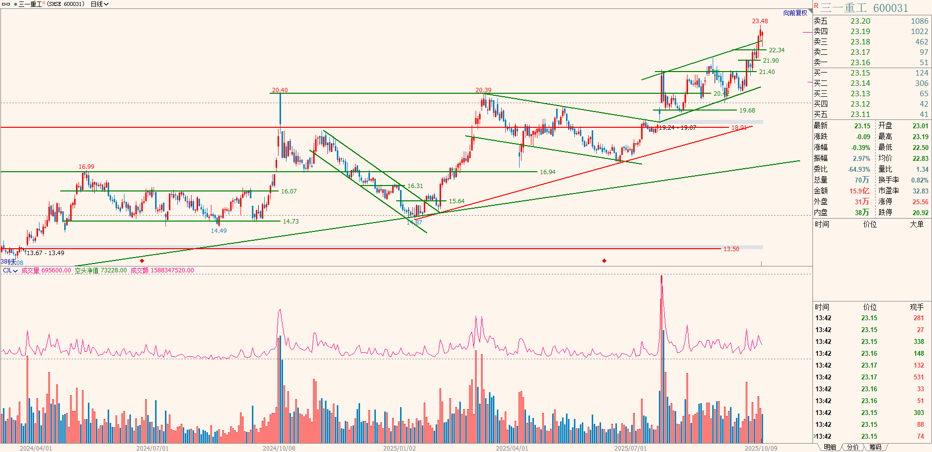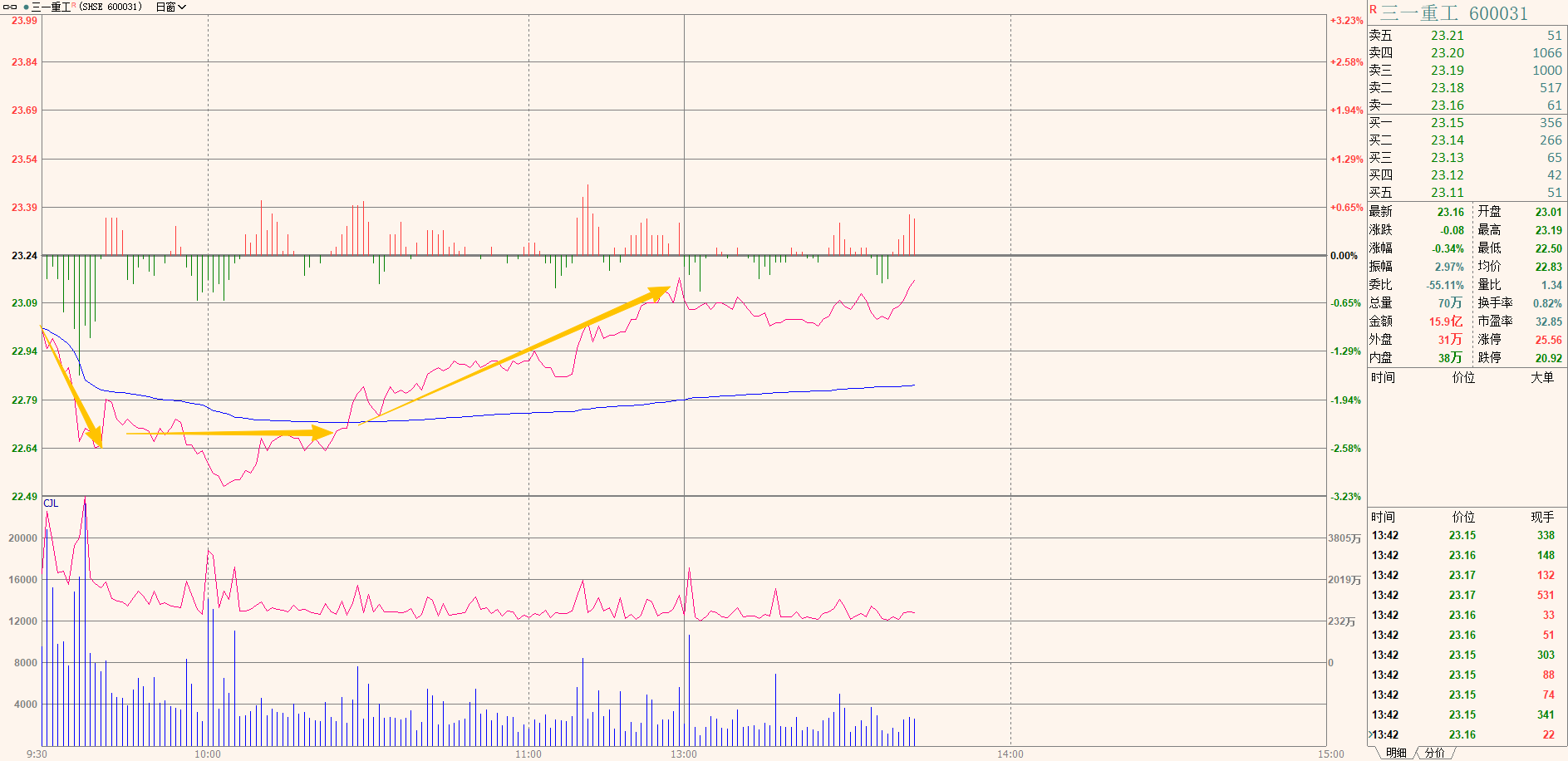 早盘股价低开,接着低走,当前股价反弹重新来到开盘价区域。那么 早盘的低开就可以视为洗盘,这里有一把短线机会。止损放在22附近