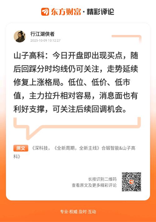早上感谢你指点,多谢啊,啱啱你指点真系关键。//@行江湖侠者 :山子高科:今日开盘即出现买点,随后回踩分时均线仍可关注,走势延续修复上涨格局。低位、低价、低市值,主力拉升相对容易,消息面也有利好支撑,可关注后续回调机会。
