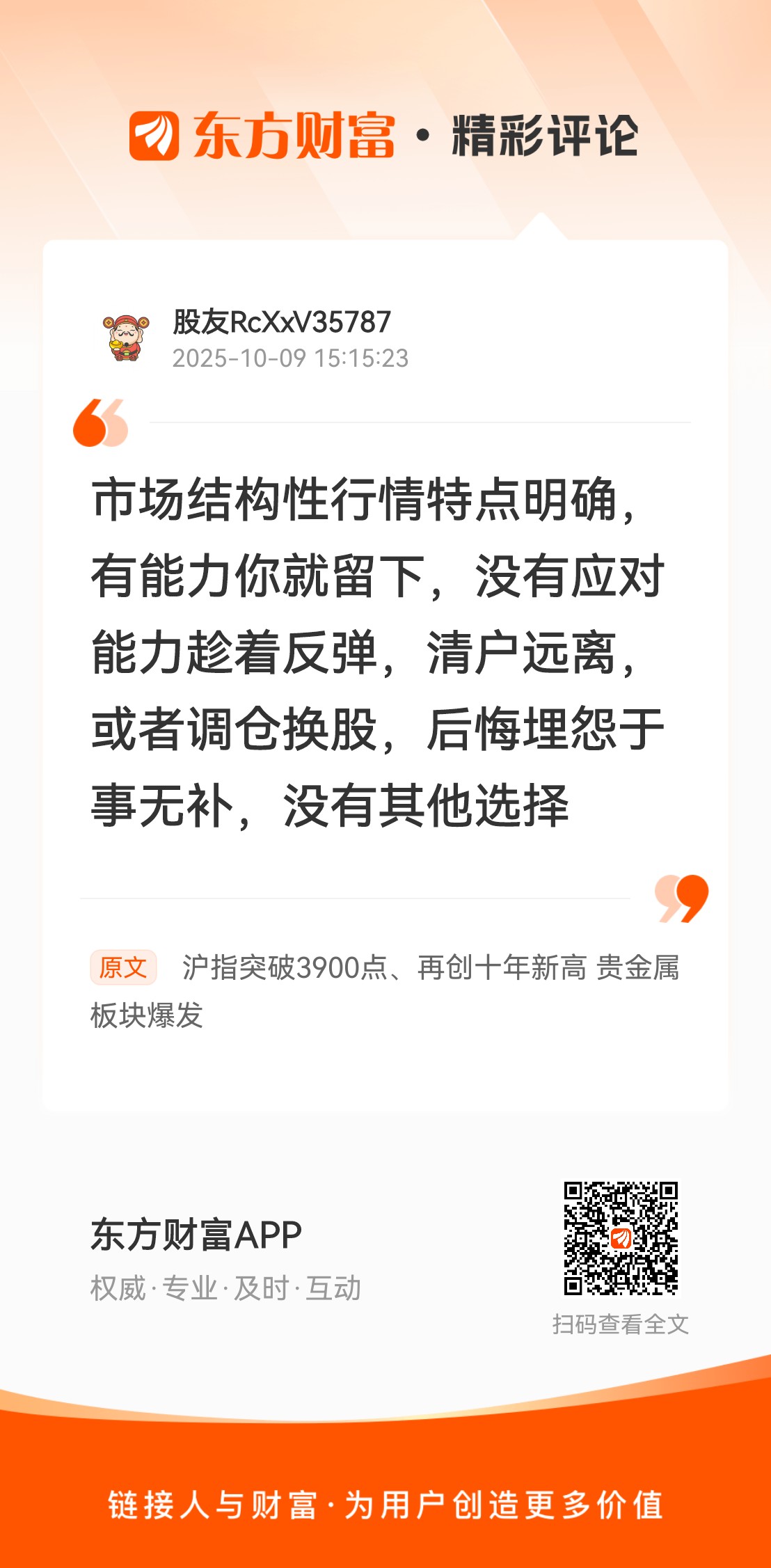 市场结构性行情特点明确,有能力你就留下,没有应对能力趁着反弹,清户远离,或者调仓换股,后悔埋怨于事无补,没有其他选择 我在《沪指突破3900点、再创十年新高 贵金属板块爆发》的评论获得了大家的关注。
