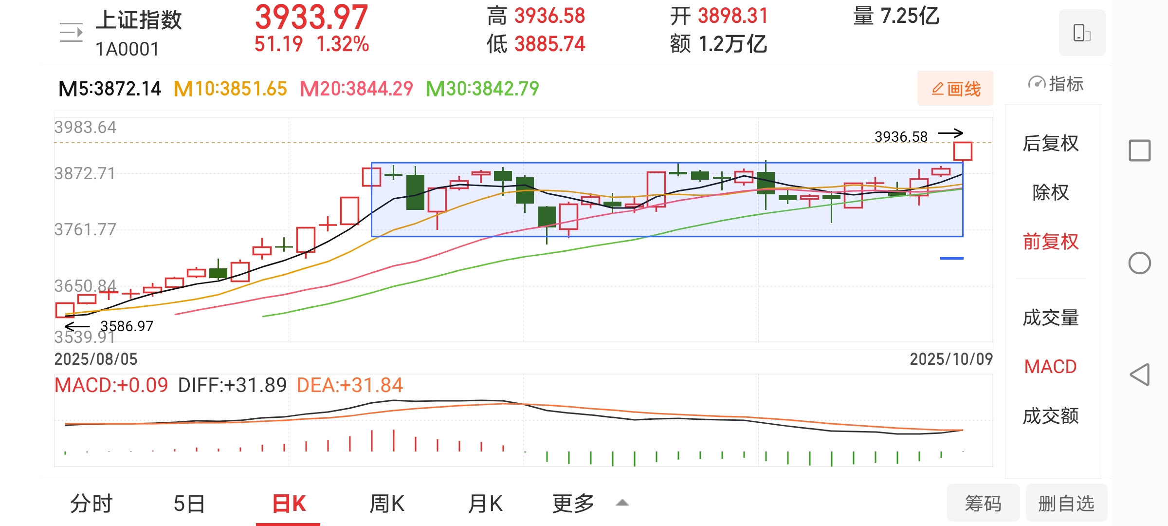 技术结构来看,大盘成功突破一个月的横盘箱体,成功站稳3900点,收盘于3936点,两市成交2.65万亿,较9月30日放量4718亿。中阳K线带下影,量价齐升突破日线箱顶,至少从技术上来观察是真突破。达瓦斯箱体理论有论述,突破箱体就要向上翻箱体,箱顶变箱底,压力变支撑。下图展示是为期1个月的震荡箱体,