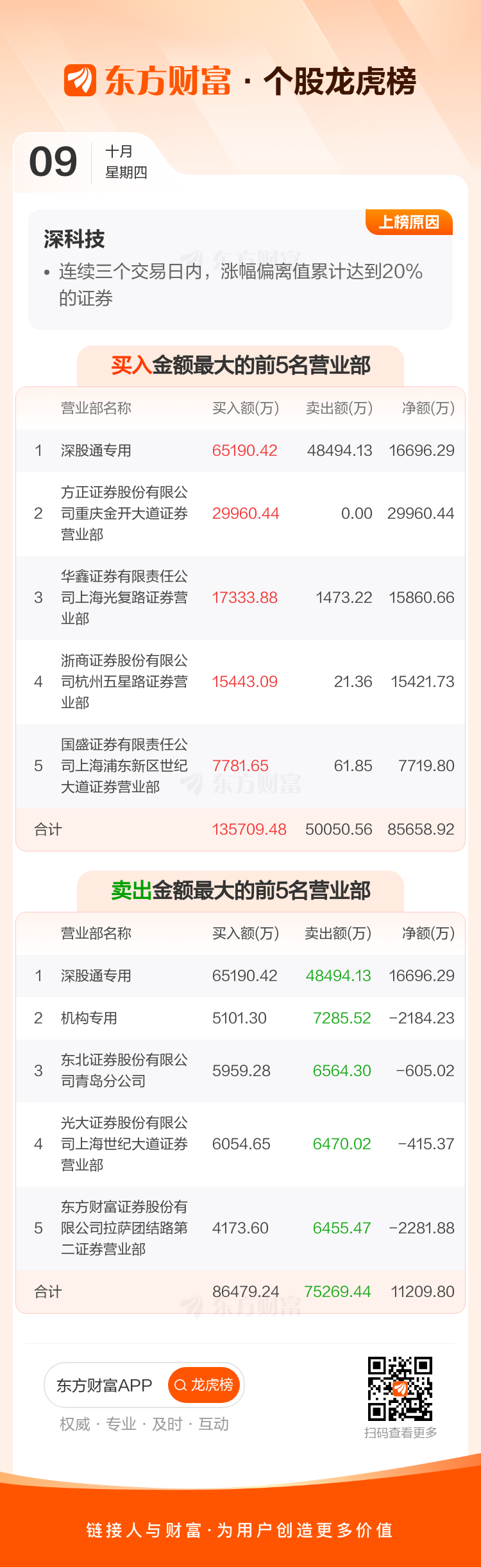 交易所2025年10月9日公布的交易公开信息显示,深科技因成为日涨幅偏离值达到7%的前5只证券、连续三个交易日内,涨幅偏离值累计达到20%的证券上榜。深科技当日收报30.66元,涨跌幅10.01%,偏离值8.79%,换手率11.25%,成交额53.84亿。异常期间9月29日至10月9日,期间涨幅25.35%,累计偏离值22.14%,区间成交额110.73亿。