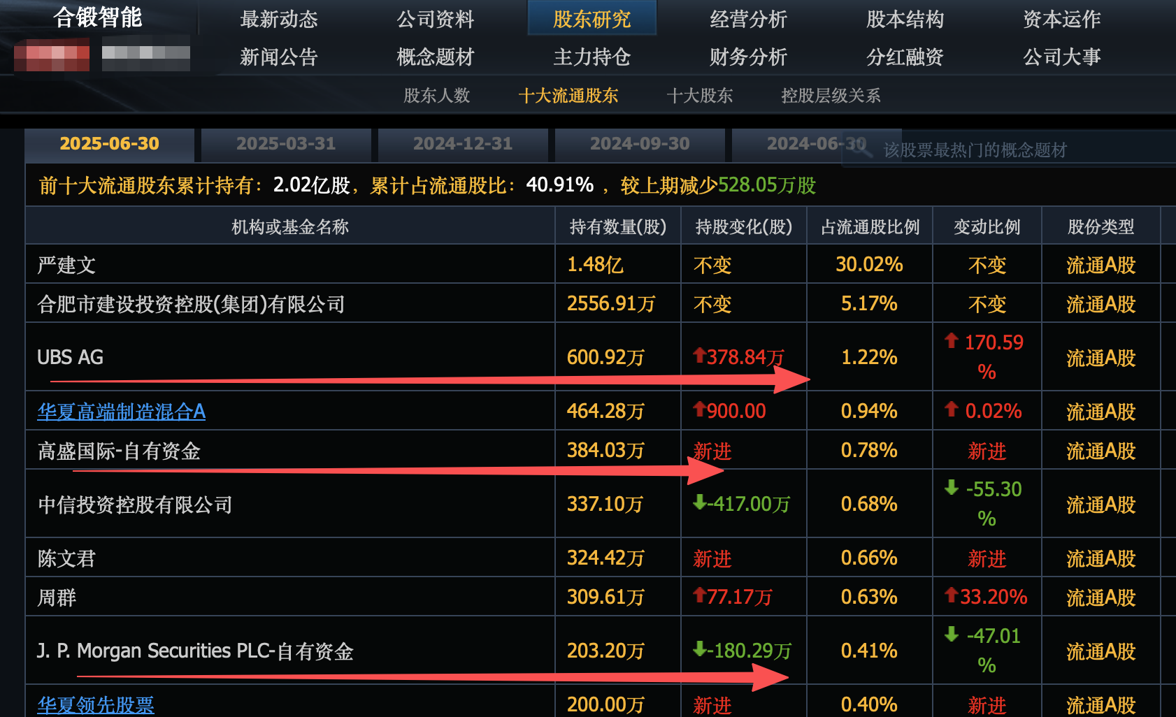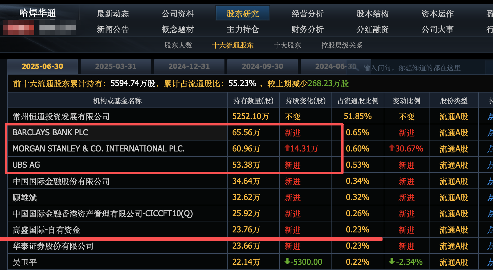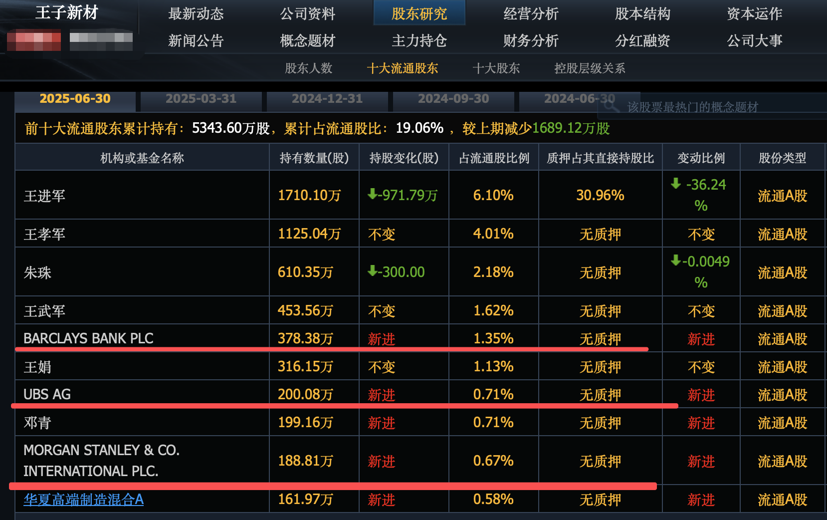 今年第二季度,巴克莱新进378万股,瑞银新进200万股,摩根士丹利新进189万股,都是直接买进前十大股东。