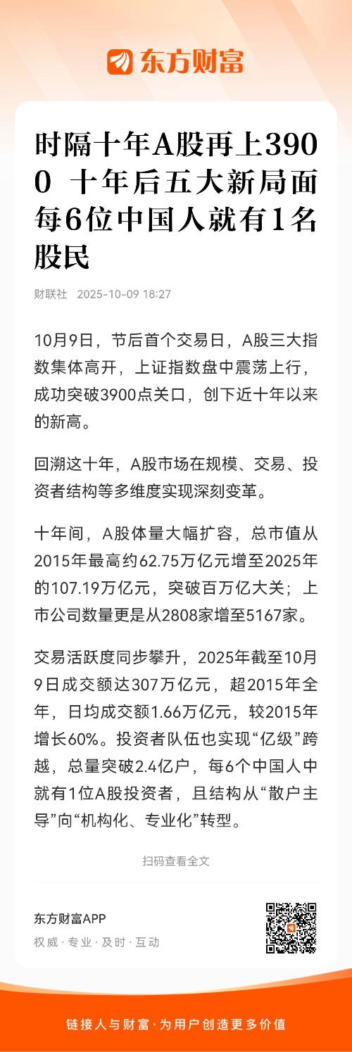 时隔十年A股再上3900 十年后五大新局面 每6位中国人就有1名股民财联社