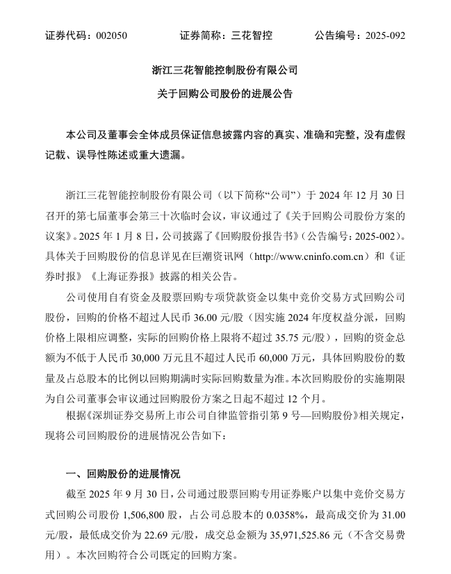 【三花智控:已回购 0.0358% 公司股份,成交总金额为 3597.15万元】