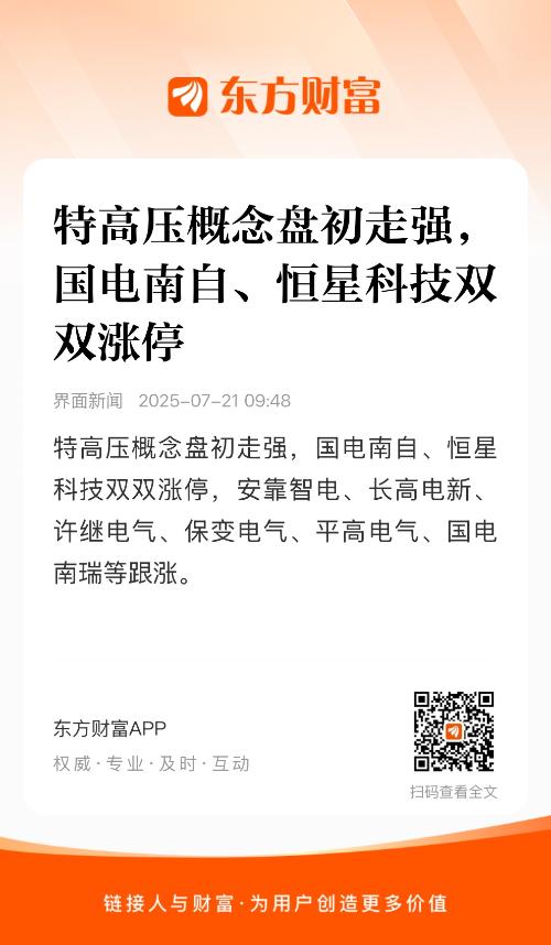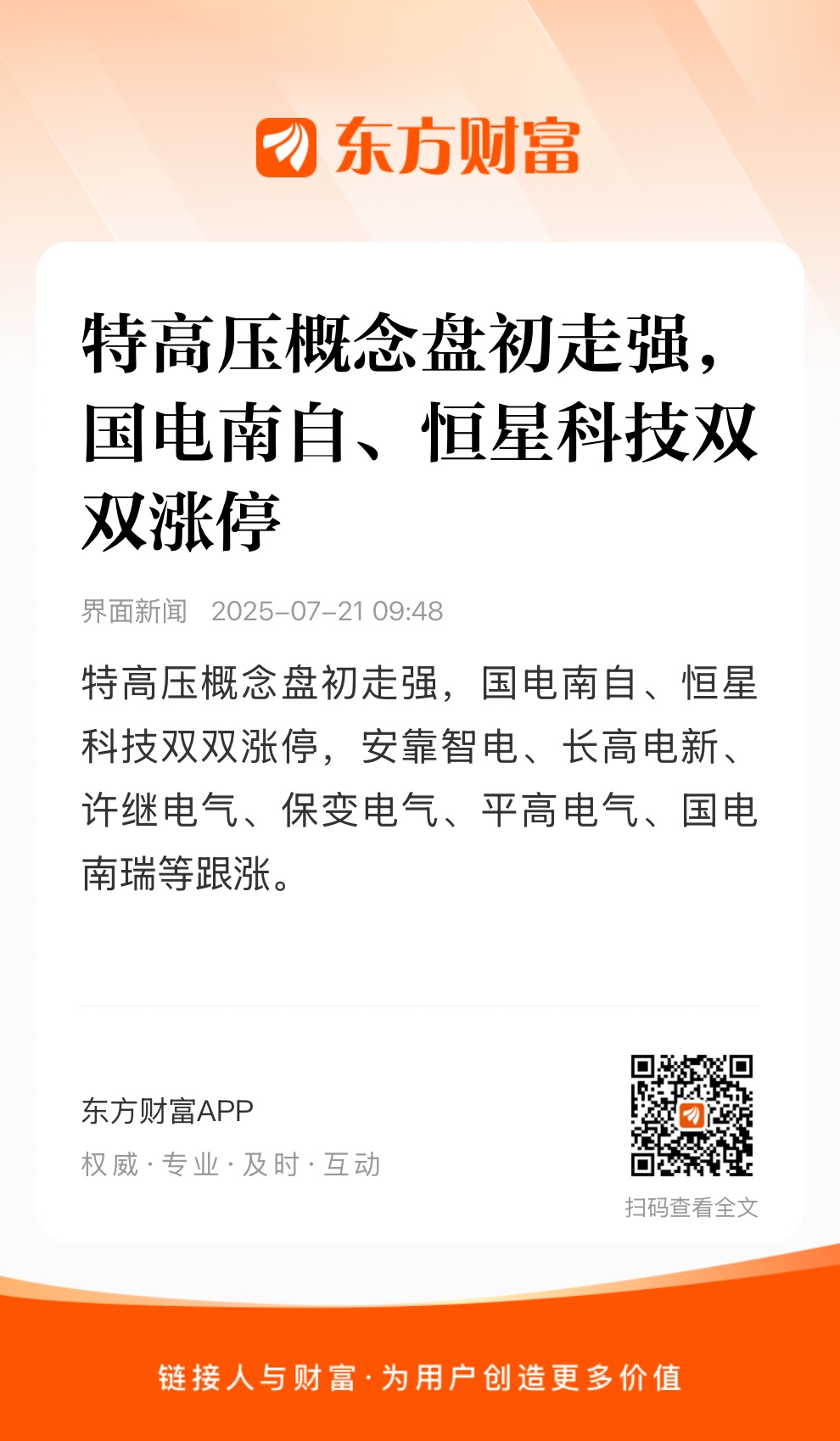 特高压概念盘初走强,国电南自、恒星科技双双涨停,安靠智电、长高电新、许继电气、保变电气、平高电气、国电南瑞等跟涨。