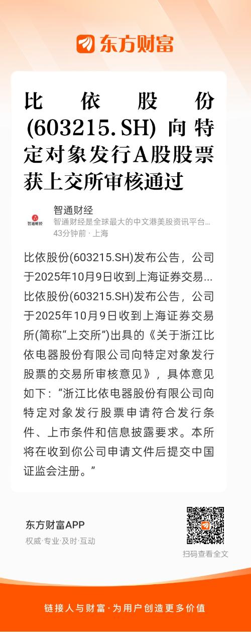 比依股份(603215.SH)发布公告,公司于2025年10月9日收到上海证券交易所(简称“上交所”)出具的《关于浙江比依电器股份有限公司向特定对象发行股票的交易所审核意见》,具体意见如下:“浙江比依电器股份有限公司向特定对象发行股票申请符合发行条件、上市条件和信息披露要求。本所将在收到你公司申请文件后提交中国证监会注册。”