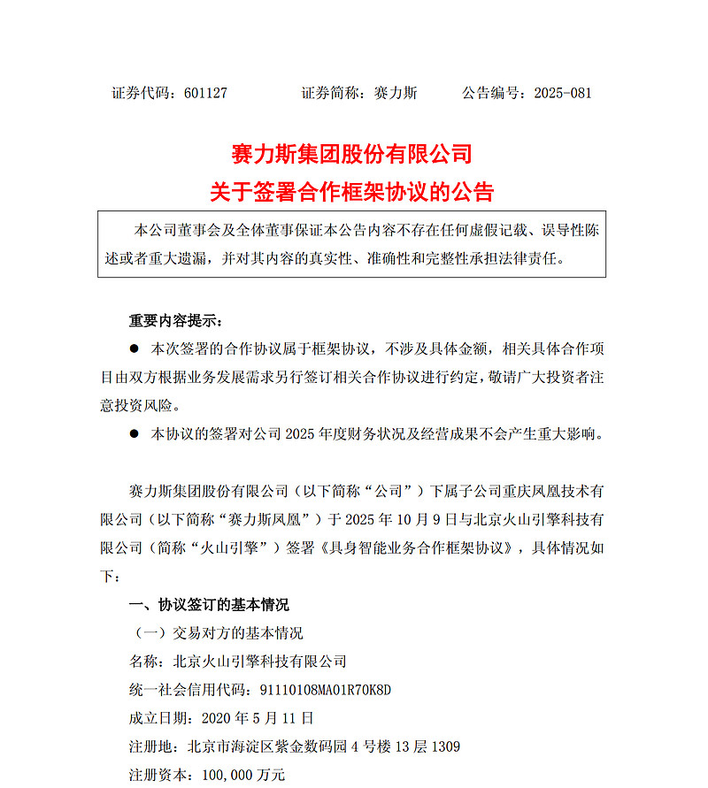 2025年10月9日,一则公告震动了整个资本市场。赛力斯集团宣布,其子公司【赛力斯凤凰】与字节跳动旗下的【火山引擎】正式签署《具身智能业务合作框架协议》。根据公告,双方将结合火山引擎在AI大模型、多模态感知等领域的技术优势与赛力斯的产业化落地能力,共同推动“有情感、更智慧、更安全、可信赖的移动智能体和生活伙伴”的研发与应用。