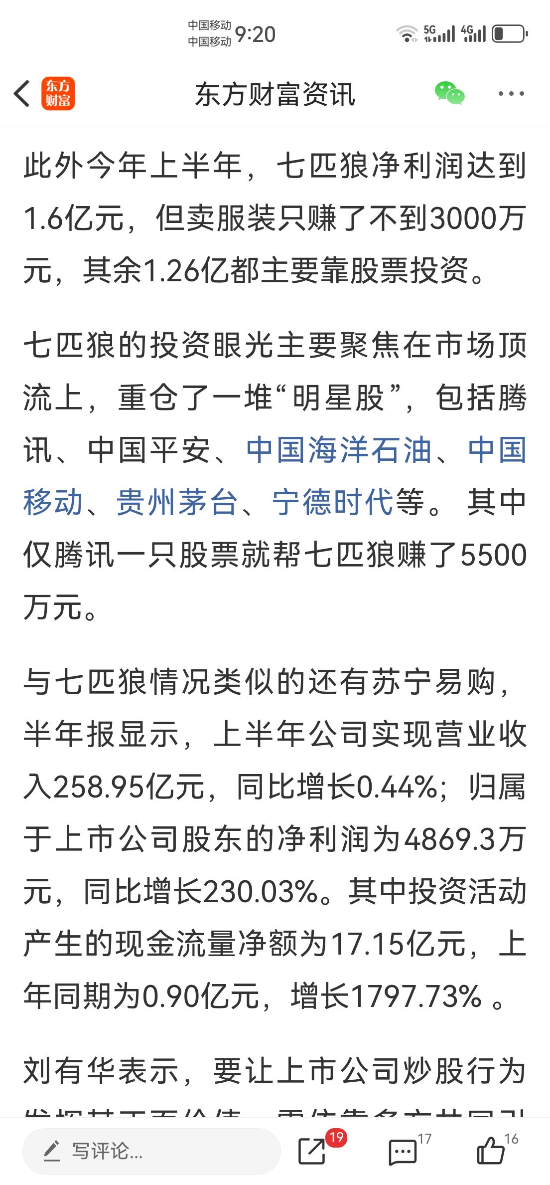 今年上半年,七匹狼净利润达到1.6亿元,但卖服装只赚了不到3000万元,其余1.26亿都主要靠股票投资。七匹狼的投资眼光主要聚焦在市场顶流上,重仓了一堆“明星股”,包括腾讯、中国平安、中国海洋石油、中国移动、贵州茅台、宁德时代等。 其中仅腾讯一只股票就帮七匹狼赚了5500万元。