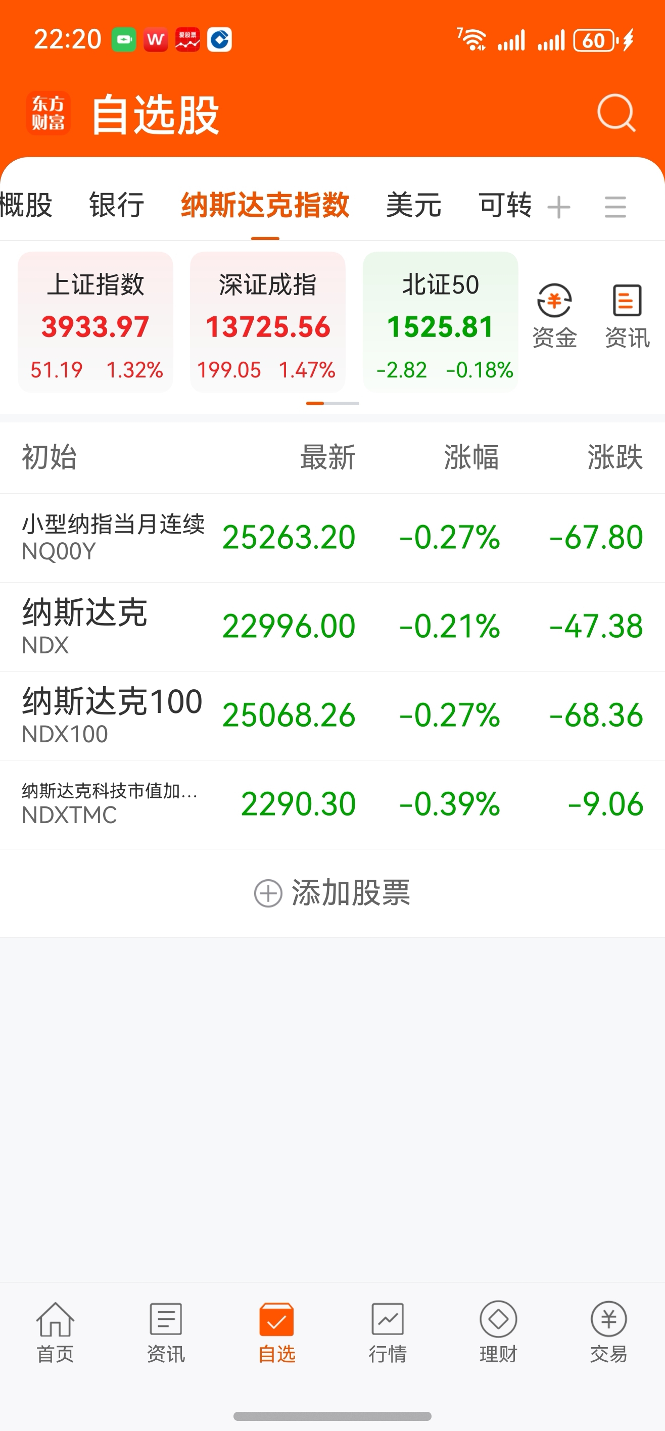 在今天晚上22点20分,观察纳斯达克100指数是跌-0.27%