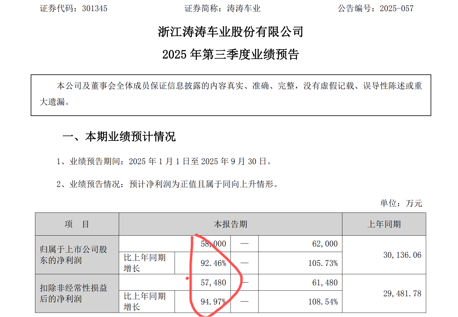 涛涛车业,三季报增长92%到106%,利润达到5.8亿到6.2亿;$涛涛车业(SZ301345)$