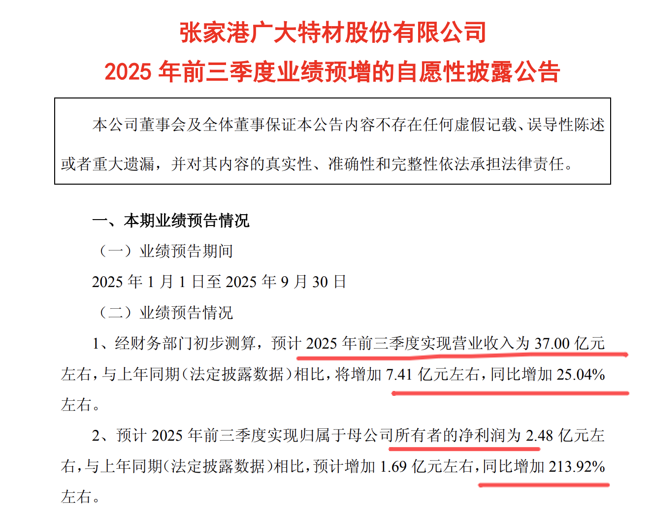 广大特材,三季报增长214%,利润达到2.48亿元;
