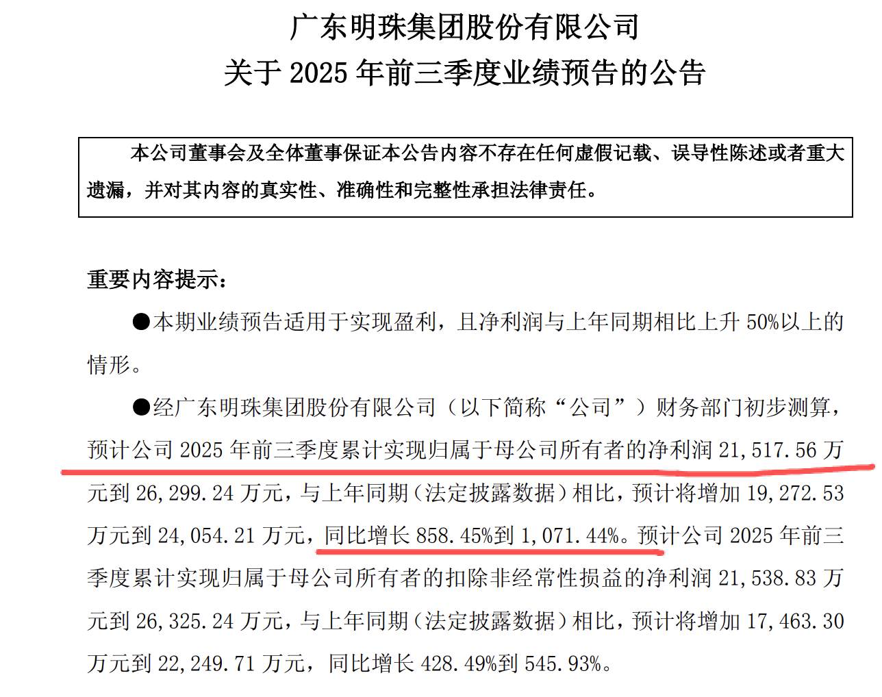 广东明珠,三季报增长858%到1071%,利润在2.15到2.63亿元;