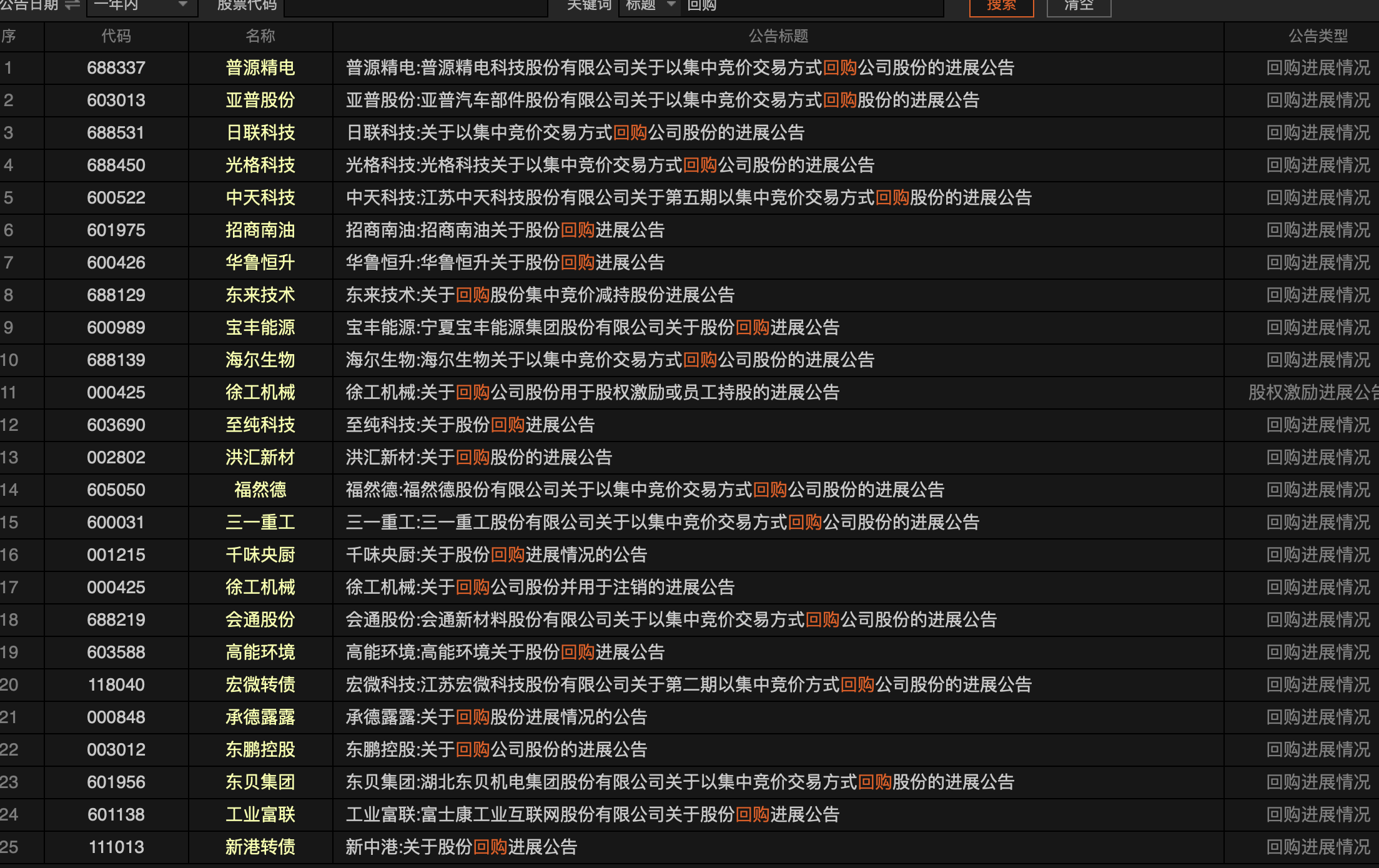 可以看到,很多公司都是完成了回购,比如普源精电,亚普股份,日联科技,光格科技,中天科技,招商南油,华鲁恒升,宝丰能源,海尔生物,徐工机械,志纯科技,这些公司都是之前发布了回购预告,现在已经完成部分回购了。比如亚普精电已经回购了500万元。