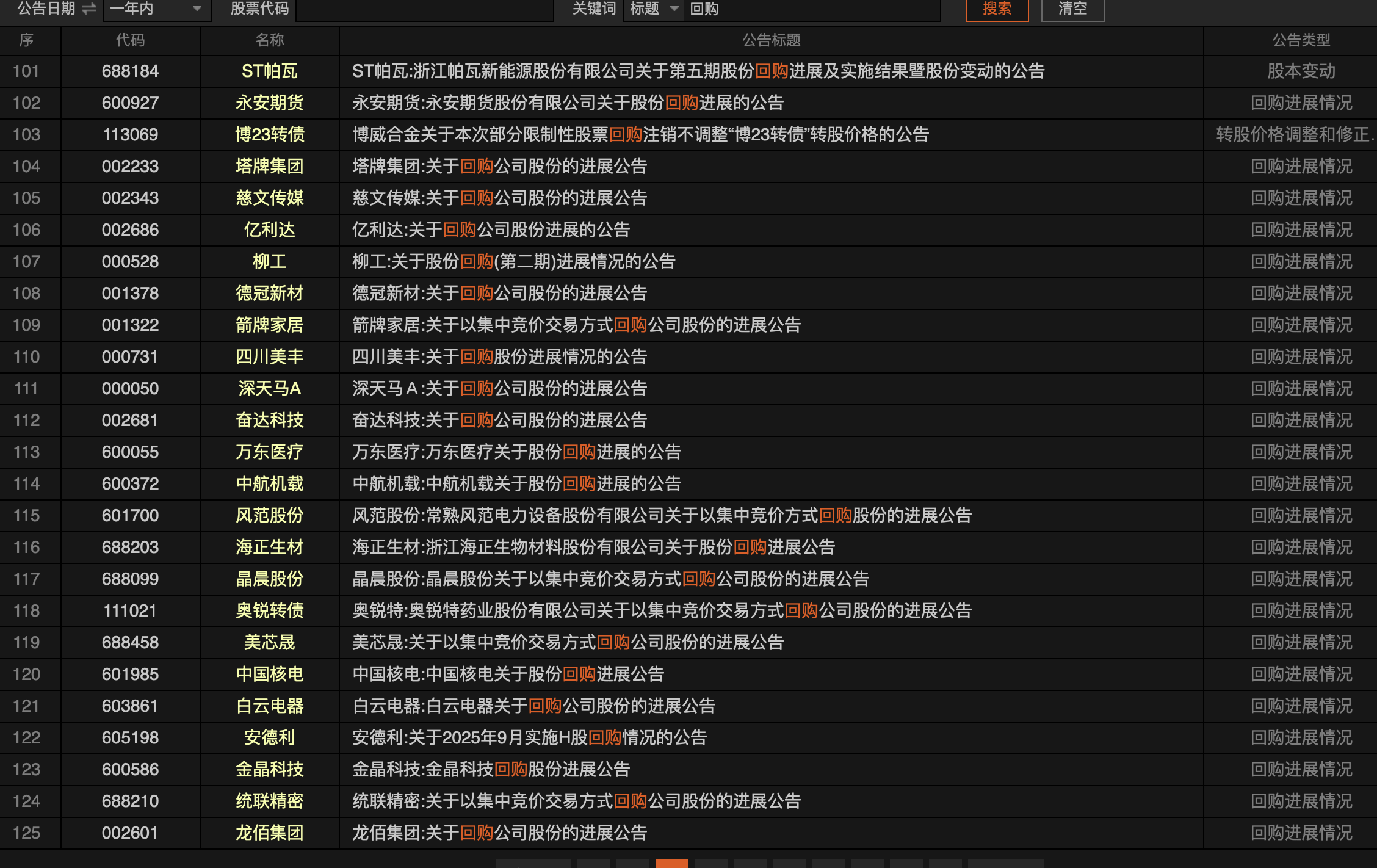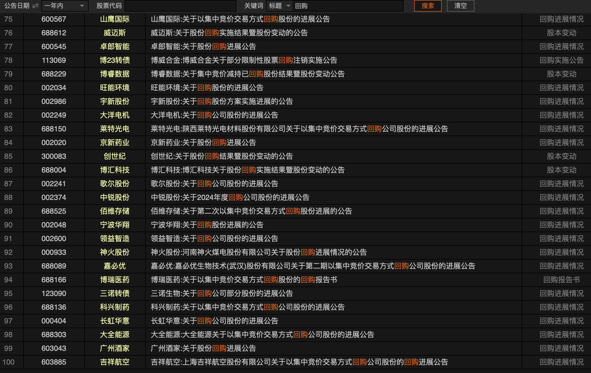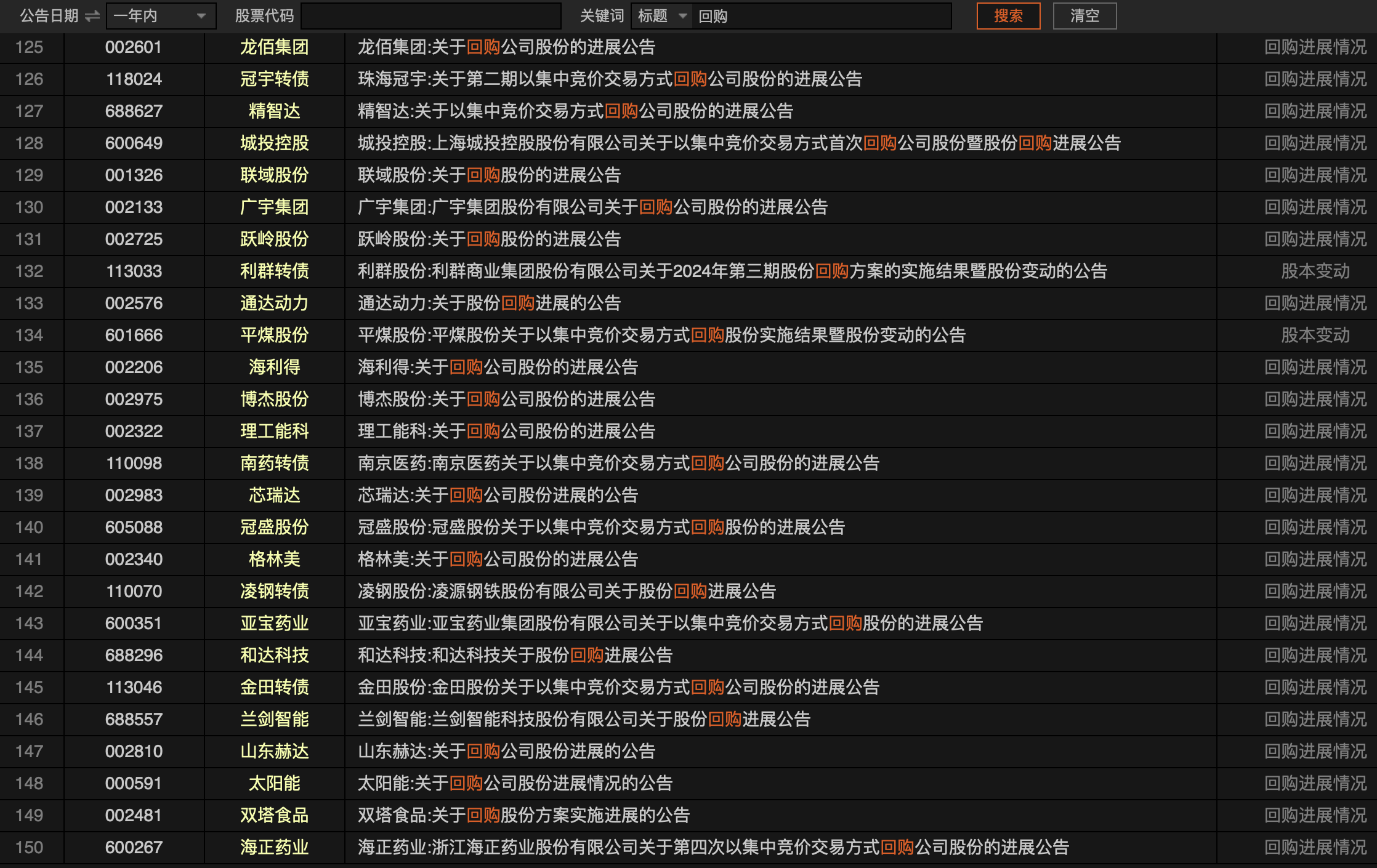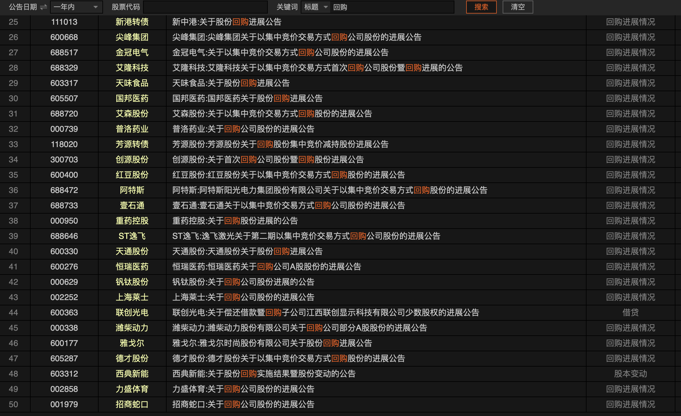 今天晚上好多回购公告啊,刚刚我看了下,吓我一条,一晚上发布了261份回购公告,这是我从来没有见过的场面。去年股价跌那么惨,没有看到有这么多公司发布回购公告,现在指数涨起来了,很多股票没有涨,这些公司也比较着急,想蹭题材蹭不上,都开始发布回购公告,想吸引投资者了,我们一起看看到底哪些公司发布回购公告,看看有没有你的持仓。