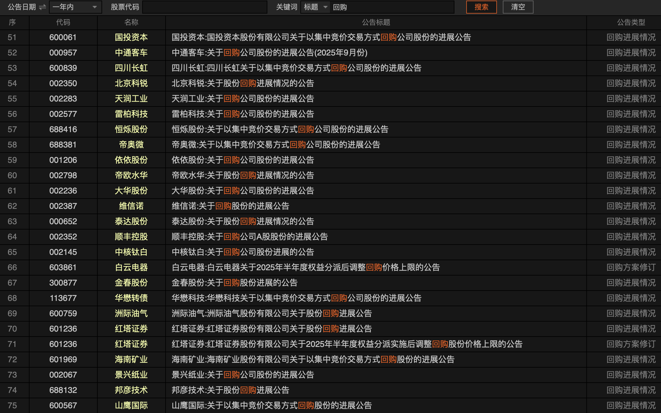 科技股也有非常多的公司回购股票,具体如下:四川长虹,北京科锐,雷柏科技,恒烁股份,帝奥微,大华股份,维信诺,中核钛白都是最近进行了回购了公告,