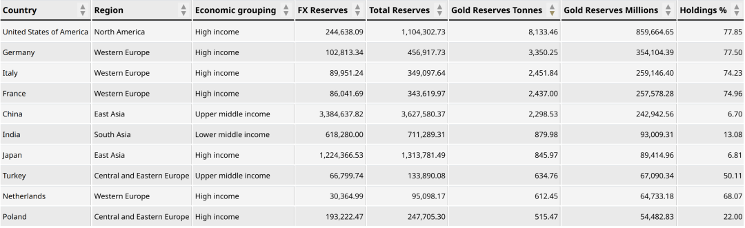 下图是截至2025年二季度全球各国央行的黄金储备,美国8133吨,德国3350吨,中国2298吨(总储备排全球第五,占比6.7%,离美德意法占比差距还不小,即使是印度也占13%,中国依然落后)。