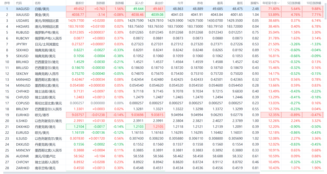 下图是全球外汇市场年初至今涨幅从高到低的排序,白银、黄金,欧元、巴西雷亚尔等表现也可圈可点。