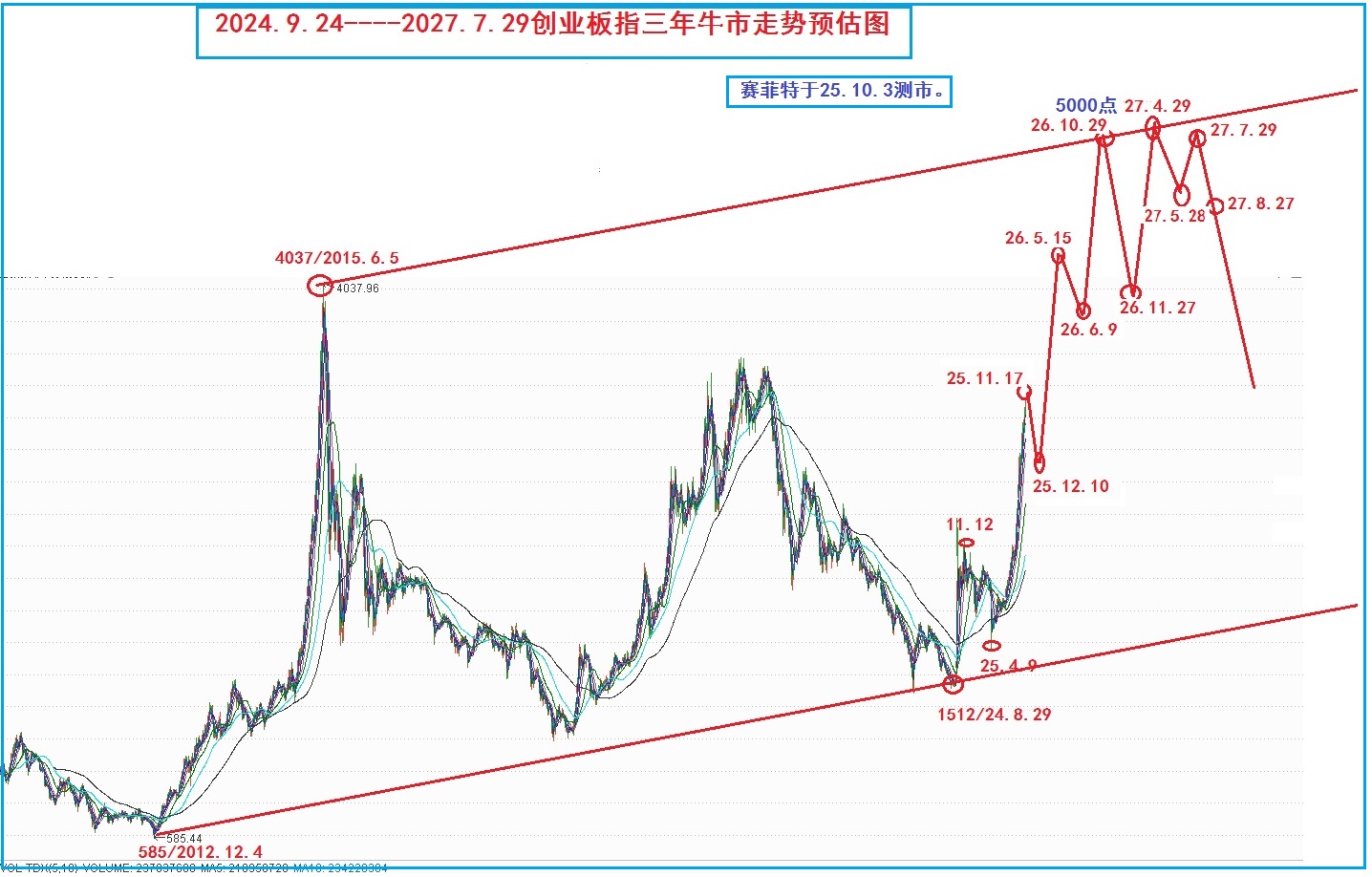 {24.9.24----27.7.29创业板指三年牛市走势预估图。} 赛菲特25.10.3