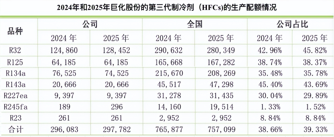 特别是,在R32这一关键品种上,2025年巨化股份的生产配额占国内总配额的45.82%,几乎是掌控了半壁江山,优势非常明显!