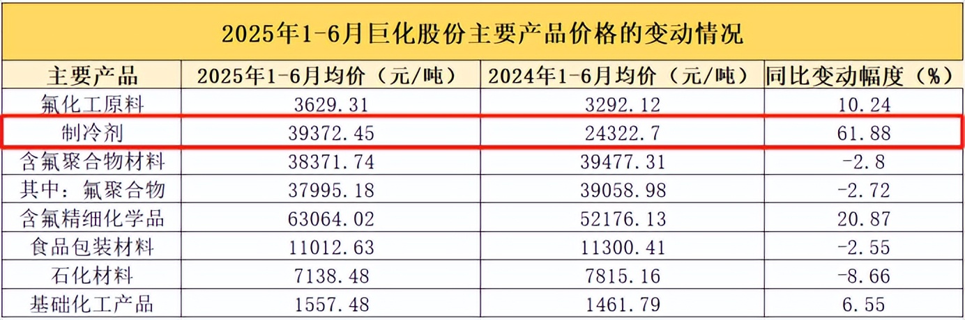 到2025年上半年,巨化股份的制冷剂均价达到3.94万元/吨,同比猛增了61.88%!即便是外销量同比下滑了4.19%,但强劲的价格增长弥补了量的缺口,进而让巨化股份的业绩大幅增长。