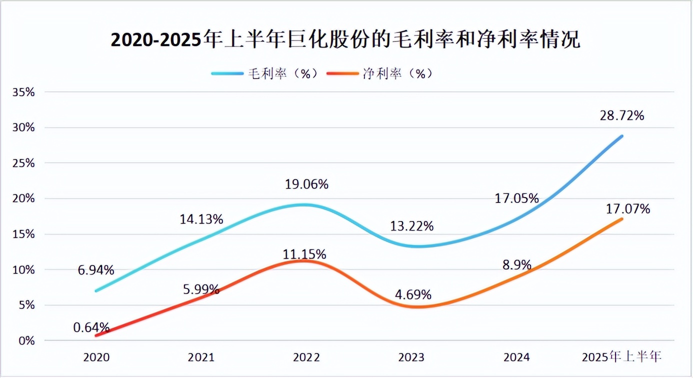 2024年开始,巨化股份的毛利率就明显回升,2025年上半年跃升到28.72%,比2024年同期猛增了11.9个百分点!